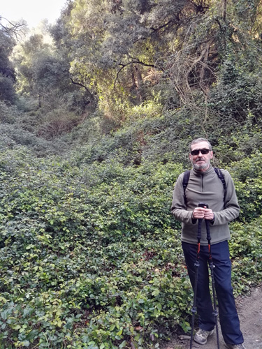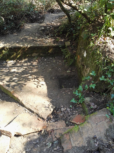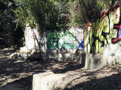 Passem entre el restaurant i la capella i a la dreta hi ha la font de Can Cerdà -plena de vegetació, troncs caiguts i impossible d'accedir-hi-. Sortirem a una pista que hem de prendre cap a la dreta, amb la indicació Font dels Caçadors. Aquí la pista puja bastant (ens passen bicis elèctriques), deixem un trencall a ma esquerra i en un revolt, un caminet a l'esquerra ens porta a la dita font dels Caçadors o d'en Güell -no gaire neta i bastant deixada-. Tornem a la pista principal.