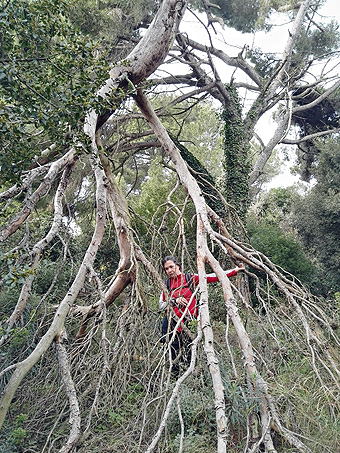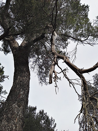 Si el seguissim fins al final arribaríem al coll de Can Cuiàs, però decidim fer una mica més i pujar al Turó d'en Merlès (417 mts). No està indicat, ens passem de llarg, i ens hem de guiar per un dels trakcs que portem. La pujada és dreta, molt dreta, tot i que molt clara: només hi ha una opció de pujada. A dalt una torre d'alta tensió i uns metres a l'esquerra, un pal de baixa.