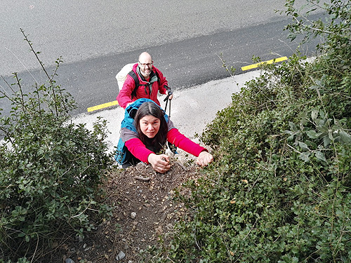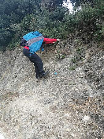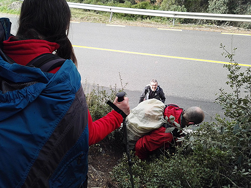Decidim baixar per l'altra banda de la muntanya cap a la carretera BV-1468 que va cap a Molins de Rei. La carretera la veiem a sota dels nostres peus i fa pensar que la baixada serà dura, ho és però menys del que pensàvem. El tram final del corriol tira cap a la nostra esquerra fins arribar a la carretera. Pots saltar els 2 metres que hi ha de desnivell o despenjar-te per uns graons de pedra que hi ha a la paret. Com al coll de les Torres (per on hauríem d'haver sortit si haguéssim anat al Castell d'Olorda).