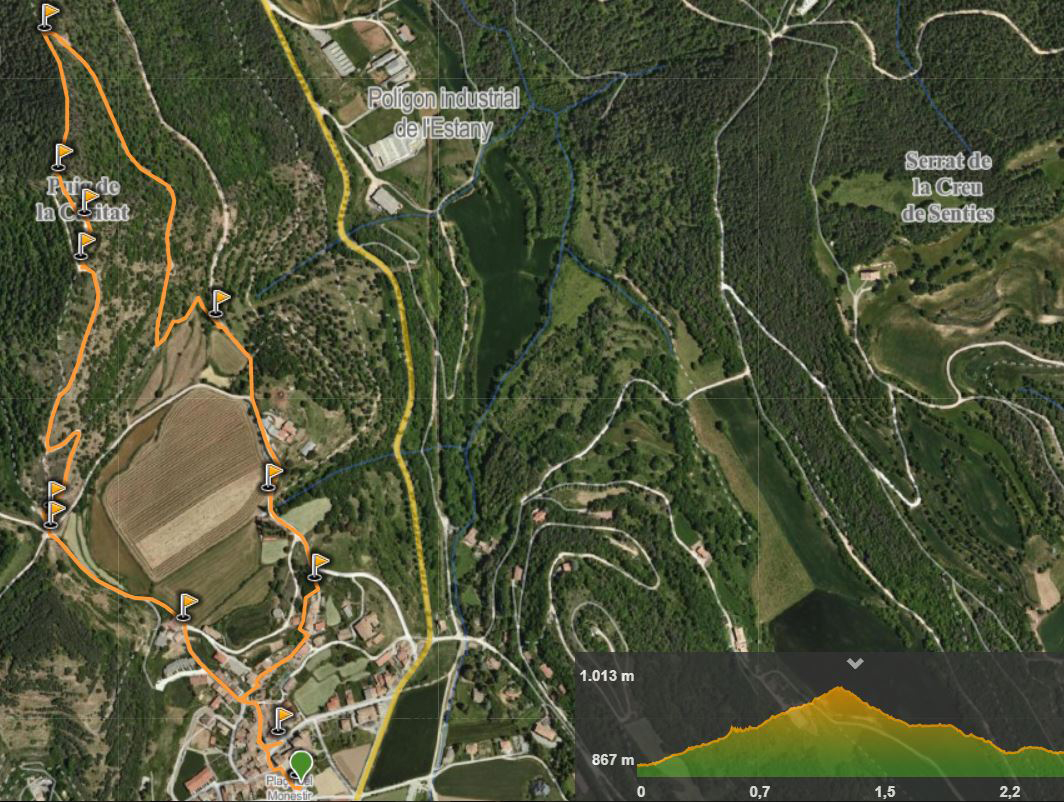 És a tocar de l'Estany, de fet, presideix el poble. Excursioneta apta per a totes les edats i que es pot fer tant per camins com per la pista que puja a dalt de tot del cim. Bon complement a un matí de visites o si no es tenen gaire ganes de caminar. Les vistes són molt bones, de Montserrat al Pirineu ja que les altres muntanyes estan molt lluny. Nosaltres vam pujar pel caminet i vam baixar per la pista. És quan vam trobar el collet de Sant Pere amb les restes de l'ermita que hi havia hagut.