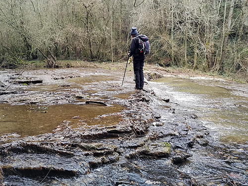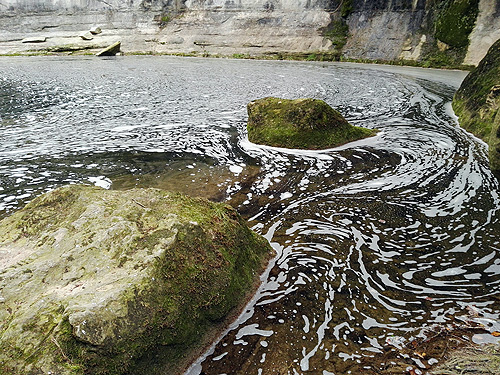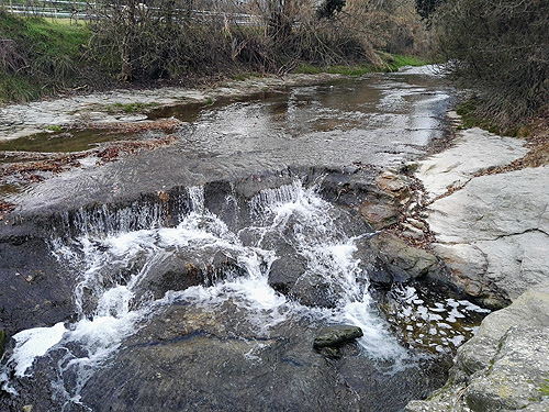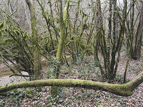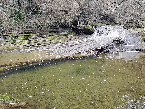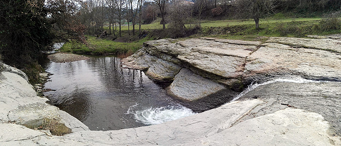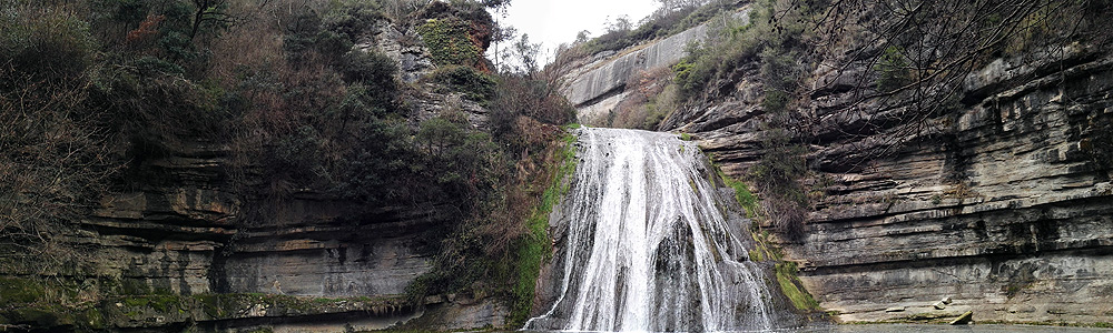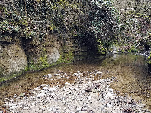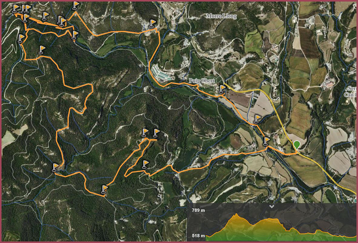 La baixada és llarga fins a trobar la riera de Sorreigs que seguirem, primer per una pista i després arran d'aigua fins a la font del Gorg Blau i a la cascada del Gorg Negre. Ens agraden molt, tot i que al Negre, l'aigua no està neta. Per fer la tornada diferent ens hem d'enfilar muntanya amunt fins a trobar una pista que ens portarà de nou a la riera i a unes grans granges de porcs. El tros que queda tant aviat va lluny com a prop de l'aigua, però la riera continua formant bonics raons amb la roca que ha polit al llarg dels segles.