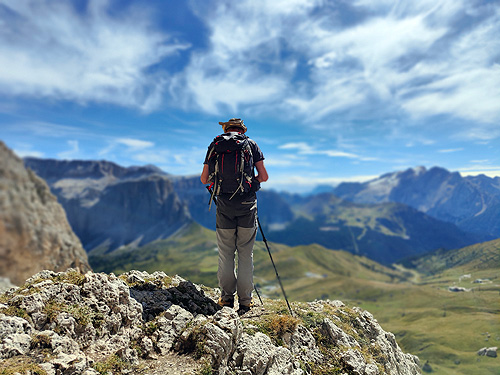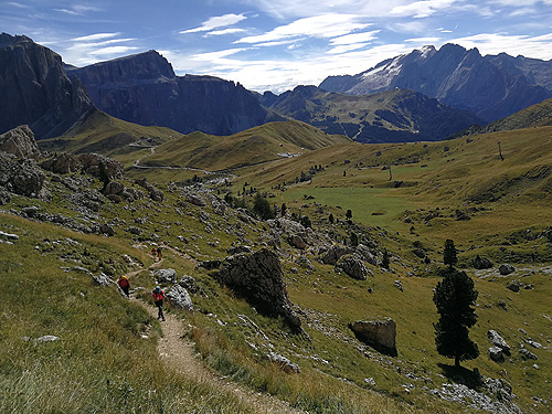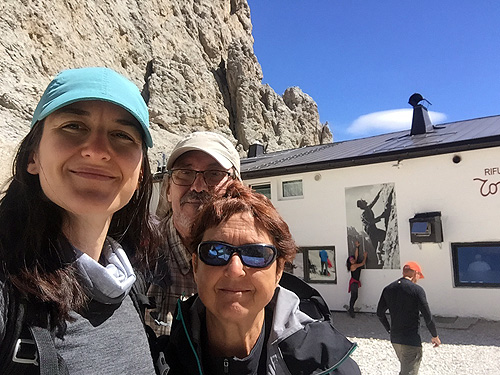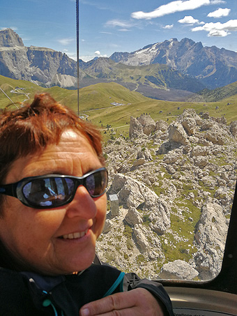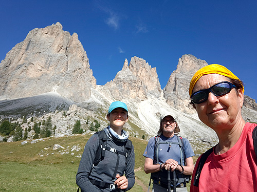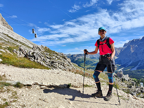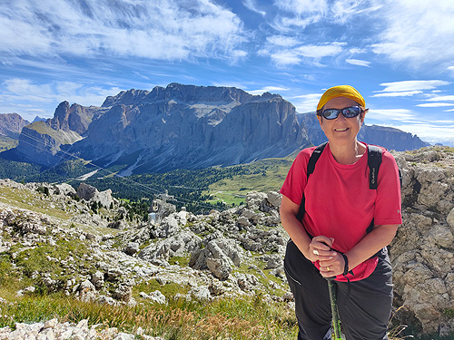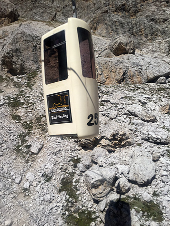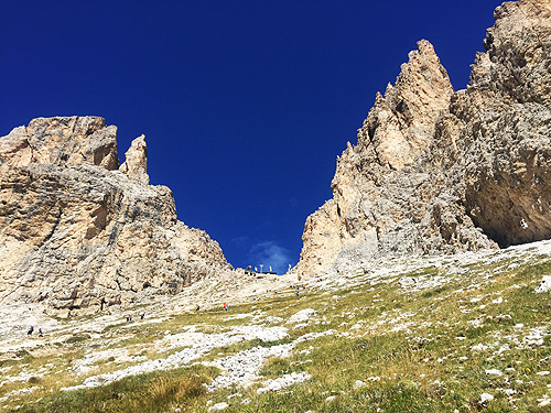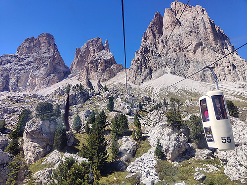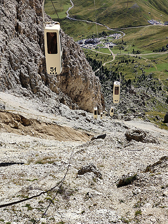 Caminant, pràcticament l'única opció d'excursió és la pujada a l'enforcadura sigui per des del Passo Sella o passant pel refugi Vicenza i pel Emilio Comici. Però aquesta segona opció era massa llarga i avui no teníem massa temps. Són uns 630 metres de desnivell i una baixada no apta per tots els genolls. Després de pensar diverses opcions decidim pujar caminant des del Passo Sella –directíssim-, dinar a dalt i baixar en telecabina. Que, per cert, és un telecabina molt especial. Li diuen “sarcòfag”, només hi caben 2 persones, s'entra per darrera i fent un saltet. Això sí, el personal t'ajuda. Quan ja has fet més de dues terceres part de la pujada, veus que molta gent s'en va cap a l'esquerra, gent que ha pujat amb casc i arnès. Van a fer una ferrada que han instal·lat aquest 2022 i que és molt espectacular. No ha de ser extemadament difícil per què hi havia grupets de nens esperant per fer-la. Ho vam deixar per un altre any. Ja he dit que les vistes són espectaculars. Afegir que es veu la Marmolada i el Grup Sella amb el Piz Boé, on vam estar fa dos dies. I que, quan estàs allà al mig de la Forcella, mirant les torres que tens a tocar, fa la sensació d'estar en un altre mon. Com seria sense gent, costa d'imaginar. Berta Solanas |