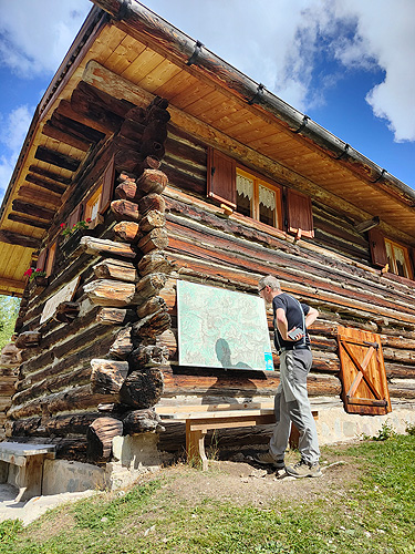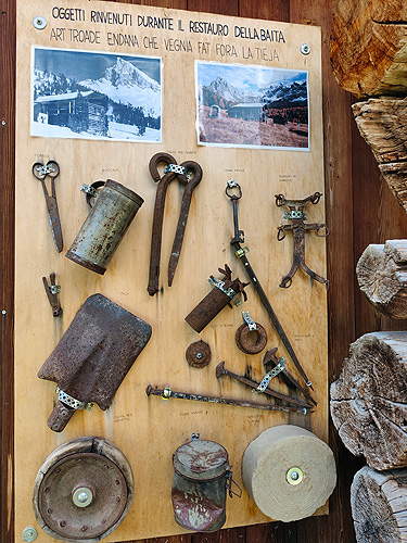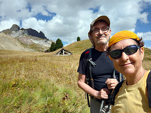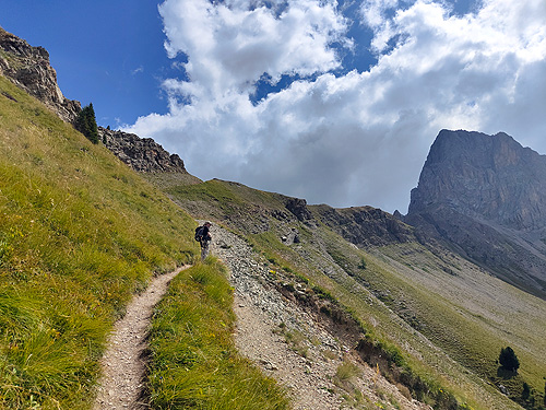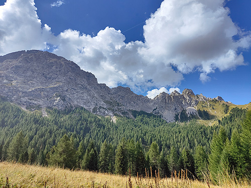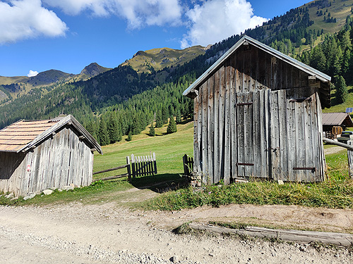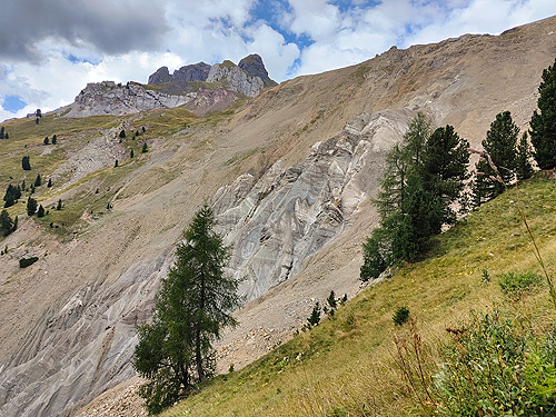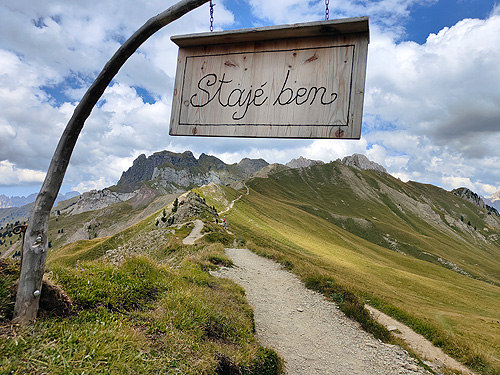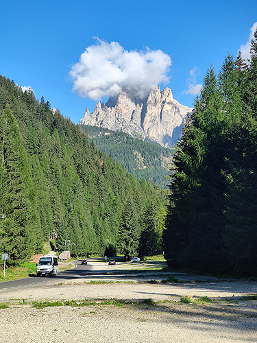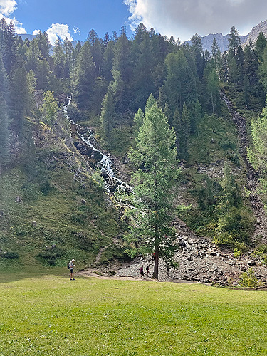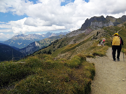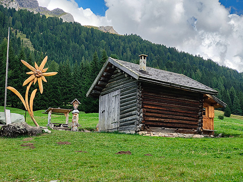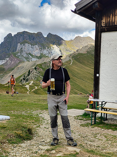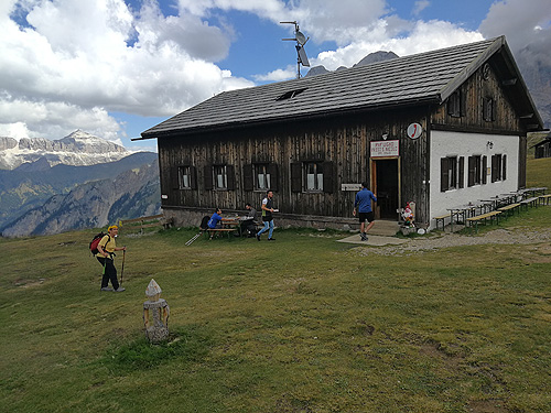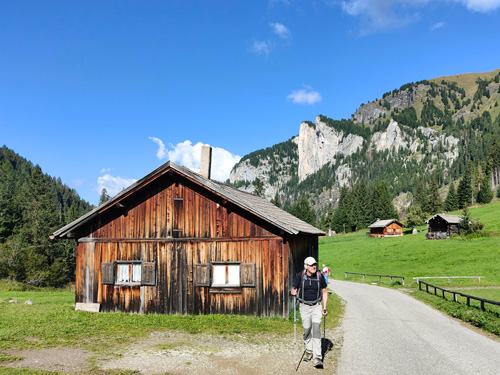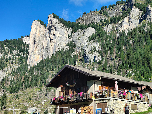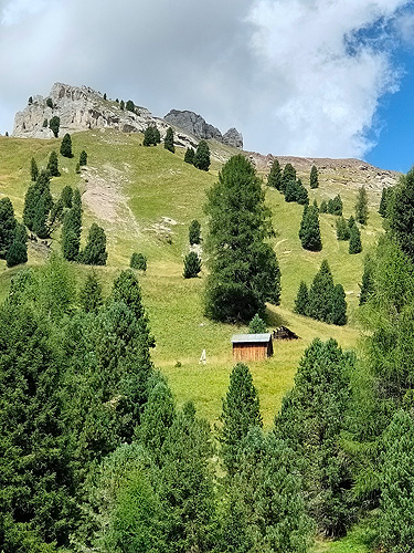 En aquest tram en navette, l'estreta carretera va encaixonada entre les parets i el riu. Un riu, per cert, ple de troncs arrencats per alguna riuada o caiguts per la neu que ningú no ha retirar. Fa molta pena. Com a contrast, tens a la teva esquena la bellessa del Catinaccio i al davant tota la vall –superverda- i les muntanyes del … que tanquen la vall formant un circ. A la dreta –sud- hi ha les que separen aquesta vall de la de San Pellegrino. Una altra característica de San Nicoló són les cabanes de pastor o de pagès que salpiquen tota la vall. Las menys, estan en mal estat. La majoria estan reconvertides en cabanes per passar el dia i algunes estan reformades i són autèntiques cases rurals. Són moníssimes i fan un mosaic entre el verd dels camps i la pedra de les muntanyes. La majoria de la gent –i n'hi havia molta- va fins a la Cascada. I dina en un dels 3 restaurant que troba (un on et deixa la navette), un altre a uns 2 quilòmetres i el tercer al davant de la Cascada. Nosaltres decidim pujar fins al Pass San Nicoló on, evidentment, hi ha un altre refugi. Als 2 metres de caminar ja veiem –quina alegria- que estarem gairebé sols. Fem la pujada pel camí més dret i més directe i la baixada pel més suau, que va per dins del bosc. A dalt, un plàtan i una mereixida birra i com no, vistes al Piz Boé. En aquest cas, la Marmolada la veiem per una cara menys coneguda, pel sudoest.