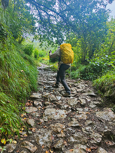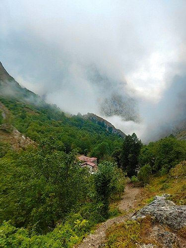 Però res de tot això va passar. Vam fer un bon esmorzar al Bar del Puente (dolç el Lluís i salat jo) i vam enfilar camí del Collado Pandébano. Ni 5 minuts havien passat que ja plovia, i boira cap amunt i també cap avall. Tot i així, vam fer 2 kms, la mitat del que pensàvem fer. No tenia sentit mullar-se per no veure res. Quan vam arribar a Bulnes ja no plovia tant, però ho seguía fent.