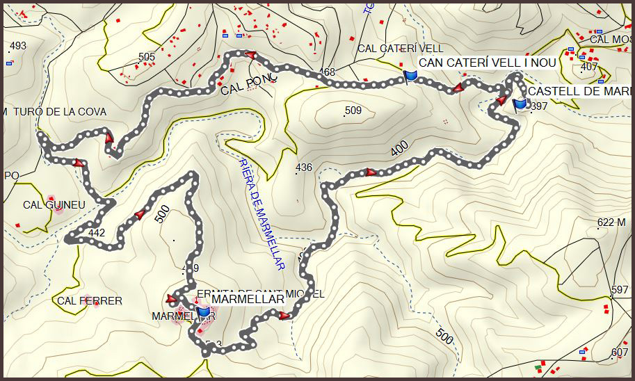 Ja a la pista tirem enrera fins al punt de la “piscina”, travessem de nou la riera i agafem un altre corriol a l'esquerra: primer passem per la piscina i seguim amunt. Hi ha parts del camí tallat (amb desviacions) per indicacions de “gossos perillosos”. El corriol fa pujada (suau) fins arribar a una pista i a una urbanització bastant deixada. Arribem després a una carretera que prenem a l'esquerra. Aquesta urbanització –Cal Pons- està més cuidada. Per no fer tanta volta, agafem una pista de terra a l'esquerra que ens portarà fins a on tenim el cotxe.