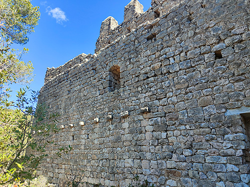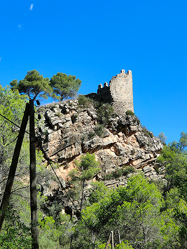 Pel camí veiem una zona d'escalada (ara prohibida per les aus) i les parets que queden del Castell. També una casa enfilada a la muntanya a l'altra banda de la Riera. I trobarem a la dreta (indicat) el camí de pujada al Castell. El primer tram és ample, de pedra solta. Arribes a un replà amb planell indicador de la planta del Castell on hi ha l'inici del segon tram, més dret, amb roca, però també força asequible. De fet, un noi que vam trobar va pujar fins a dalt amb la bici (i no era lleugera).