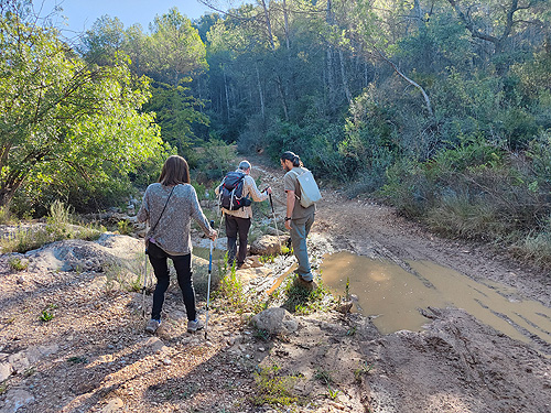 Baixem pel corriol fins arribar a la riera i a una pista que seguim cap a l'esquerra. Travessarem la riera 8-9 vegades.