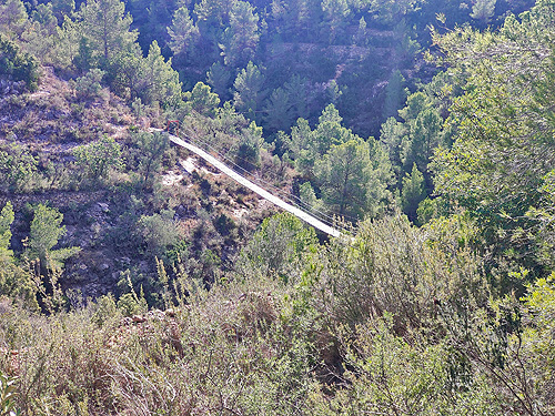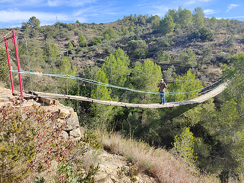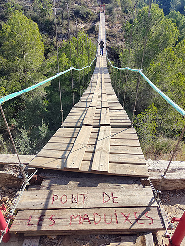 Tenia reservada aquesta passejada per quan estiguéssim a prop de Tortosa i ens sobrés una mica de temps. I la vam fer camí de la Tinença de Benifassà on anàvem a passar aquests 3 dies de novembre que jo tenia festa. La veritat és que hi ha molt poca informació sobre els Ponts. Només un Facebook de qui els va fer i que és el propietari de les terres per què per accedir-hi es passa per terrenys privats amb el seu permís, això si. Sigui com sigui, si no tens vertígen, té gràcia passar per aquests ponts tibetans que creuen els barrancs de la Montserrada. El de les Maduixes té uns 50 metres i el de la Rabosa, uns 25.
