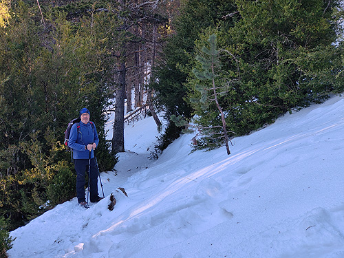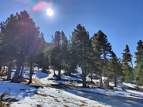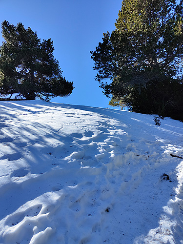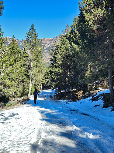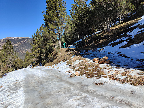 El camí és senzill, passar les edificacions de l'estació i seguir la pista fins a un gran pla on hem d'agafar un caminet a la dreta i cap avall. A la pista trams amb neu, alguns amb gel i amb terra. Al corriol tot amb neu.