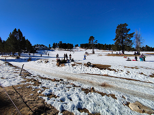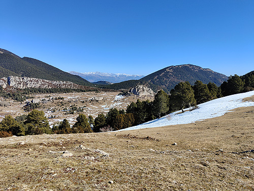 Dia assoleiat de febrer, molt assoleiat i com nosaltres va pensar molta gent. Abarrotat l'aparcament a Rasos de Peguera (quan està ple s'aparca a la mateixa carretera que l'últim tram és d'una sol sentit) amb molta, molta gent que va anar a tocar la neu. Fa dècades que l'estació d'esquí és tancada i famílies amb nens, sobre tot, ho aprofiten per tirar-se amb trineu o senzillament per petites passejades. A uns 200 metres dels cotxes, pràcticament ja estàvem sols.