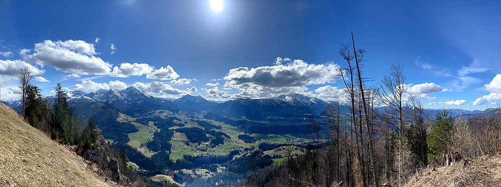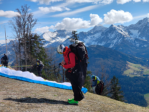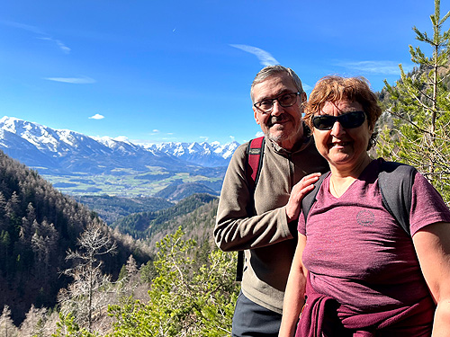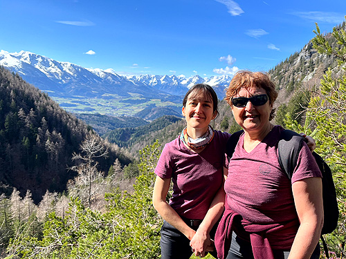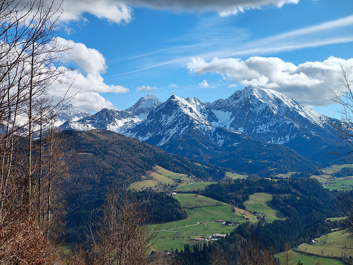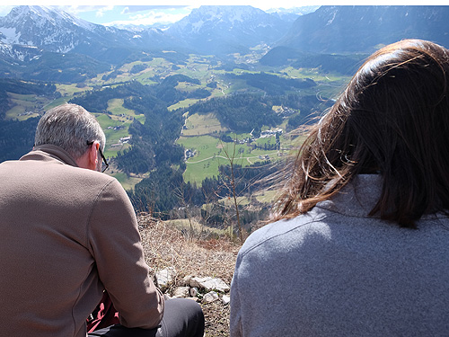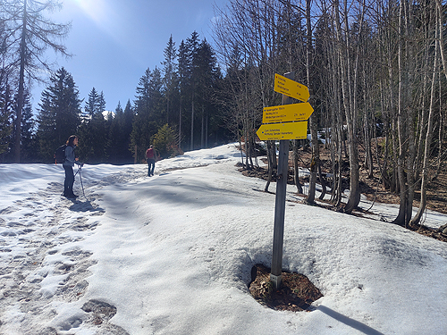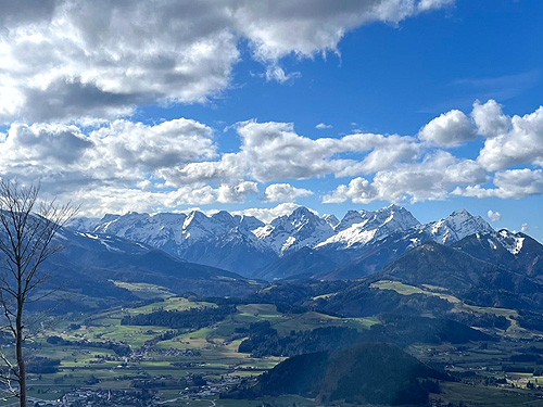 El poble també ens va agradar molt (visita nocturna) i a les cases hi havia uns cartells amb la història de què havia estat aquell establiment. Poca gent pel carrer per l'hora que era però es veia un poble amb molta activitat per lo petit que era, moltes botigues (dues amb roba tradicional de festa), restaurants i altres negocis i serveis. L'excursió és una circular de prop d'11 quilòmetres i uns 650 metres de desnivell. El desnivell es fa sobre tot en el primer tram i en l'últim per pujar al cim on estan les antenes. La part central és un llarg franqueig a mitja alçada de la muntanya, un contínu puja-baixa entre boscos de pi i faig. És molt maco però amb neu pot arribar a ser bastant perillós ja que el camí és molt estret i el pendent de caiguda molt gran. Des de mitja excursió es tenen fantàstiques vistes (ara nevades) tot mirant cap al sud. Nosaltres am trobar molt poca neu, només a la pista un cop acabat el franqueig (cara nord) i en la pujada final al cim, al Kleinerberg de 1.287 mts. Un cim des del que es llencen en parapent com vam poder comprovar. Des del cim, a les vistes de les muntanyes nevades s'afegeix el de les valls que hi ha a menys alçada. Tot plegat un espectacle fantàstic. A la tornada passem per la part superior de l'estació d'esquí del poble al cim del Wurbauerkogel (ara tancada pq no tenen neu) i per un bosc de faig i pi arribem a on tenim el cotxe. Berta Solanas |