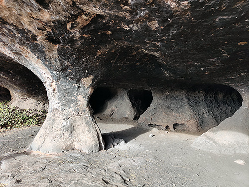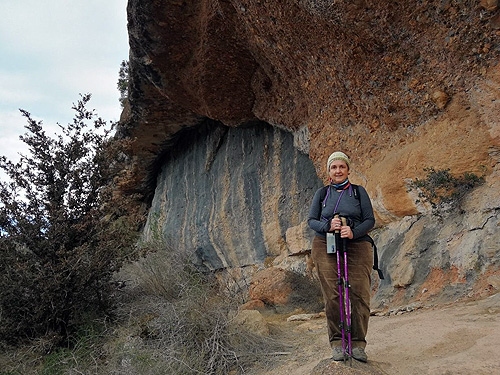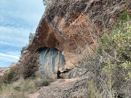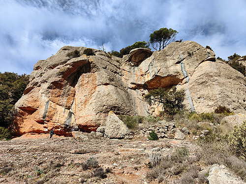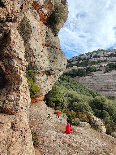 El baixem i seguim caminant cap a la Roca Petanta que tenim al davant. És un caminet estret, ara pel bosc, ara pel pendent rocòs (s'ha de vigilar ja que la timba cap a la canal de l'Abella és forta), però sense baixar gaire. I així arribem a una paret amb 3 sostres, seguim cap a la dreta i trobem la Bauma Sescorts (que jo més aviat li diria cova). Al voltant, moltes parets d'escalada amb sostrets i extraploms.