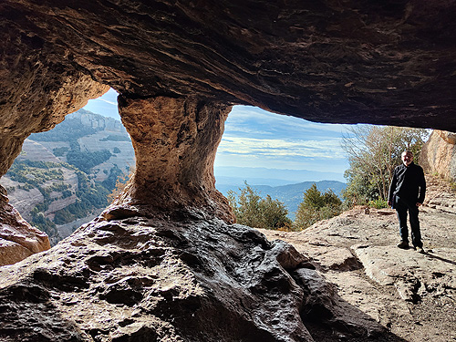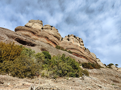 Arribem a una cruïlla (sense cap cartell). Agafem cap a l'esquerra per anar fins a la Bauma Blava. Hem de desfer aquest camí i agafar, ara si, la de la dreta que puja fort i amb un petit tram de grimpada. Sortim a la carena i veiem la Mola. Seguim cap a l'esquerra i pugem un minigturonet que és com el sostre de la Bauma Blava.