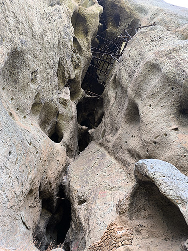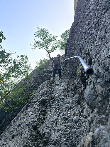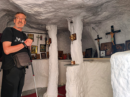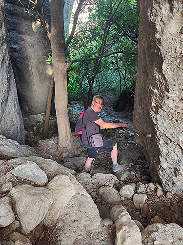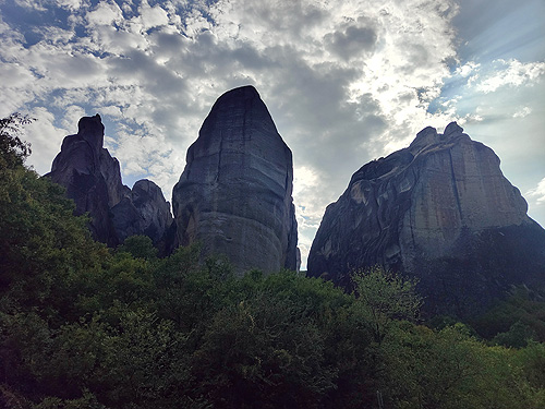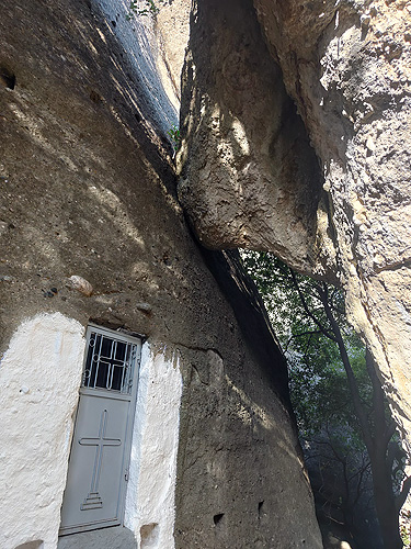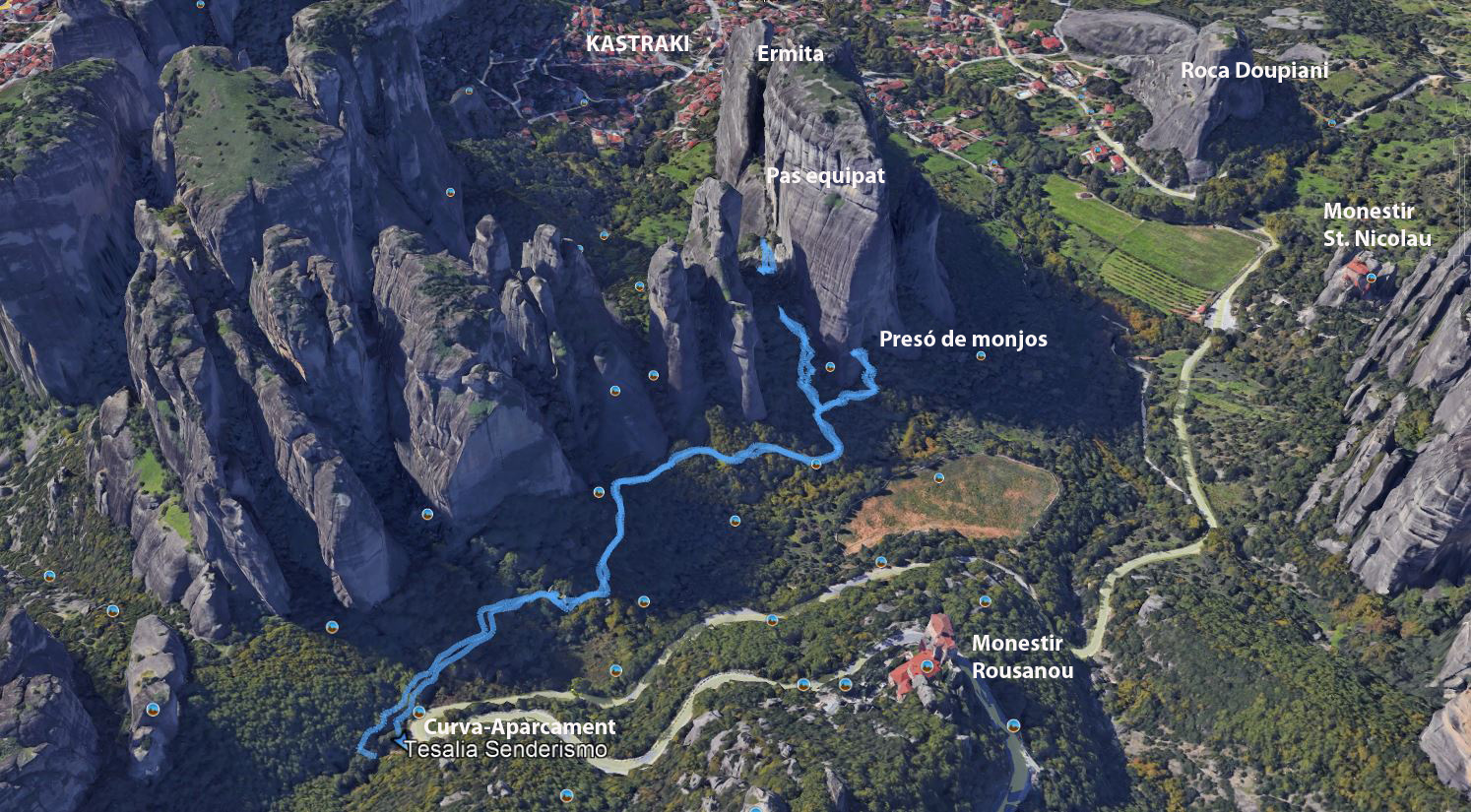 Avui al matí hem fet visita a 2 monestirs i hem estat a prop de 2 més. Hem pensat que no calia veure'ls tots per dins. I encara que sóc ràcana, no era pels 5€ que va entrar a cadascun d'ells. Però com que també hi ha altres camins i rutes, a la tarda vam decidir anar a una que jo havia trobat i que semblava curteta alhora que curiosa. I és aquesta, la que passa per una presó pels monjos “dolents”, i que després enllaça amb un camí circular pels Meteors. El que diuen “Presó” és una gran escletxa d'un meteor, com una bauma vertical. El que podríem dir les “cel·les”, son forats a la roca als que s'hi accedia amb escales de corda. És realment impressionant si et poses a sota. Ets minúscula comparat amb l'alçada de la bauma. La resta de l'excursioneta va pel camí que connecta la zona de meteors de Kastraki amb la de Kalambaka. Quan s'hi arriba al coll, es gira a la dreta per un pendent important amb una cadena. A dalt, trobem una petita ermita –oberta- i un pas amb una escala que et situa gairebé a sobre d'un meteor. Molt xulo i fora de les zones més plenes de turistes i visitants. |