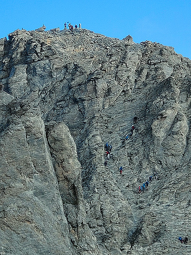 El que fa la majoria dels que hi volen pujar és anar fins a l'Skala, no té cap problemes –més distància i una mica més de desnivell- Però per a pujar al Mytikas s'ha d'anar amb casc i, segons, com, encordat. Hi ha una bona grimpada de més de 100 metres.