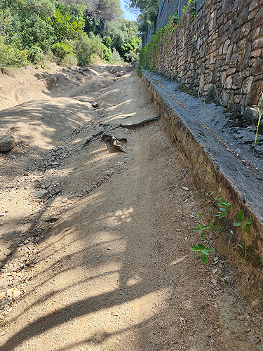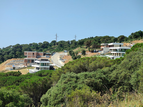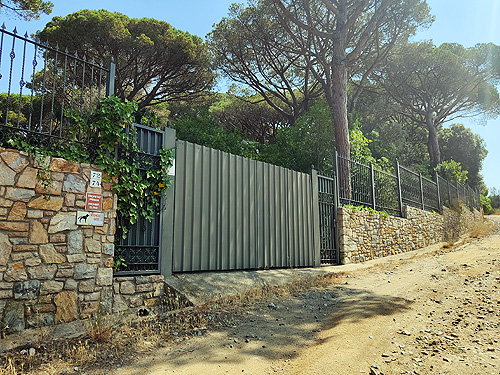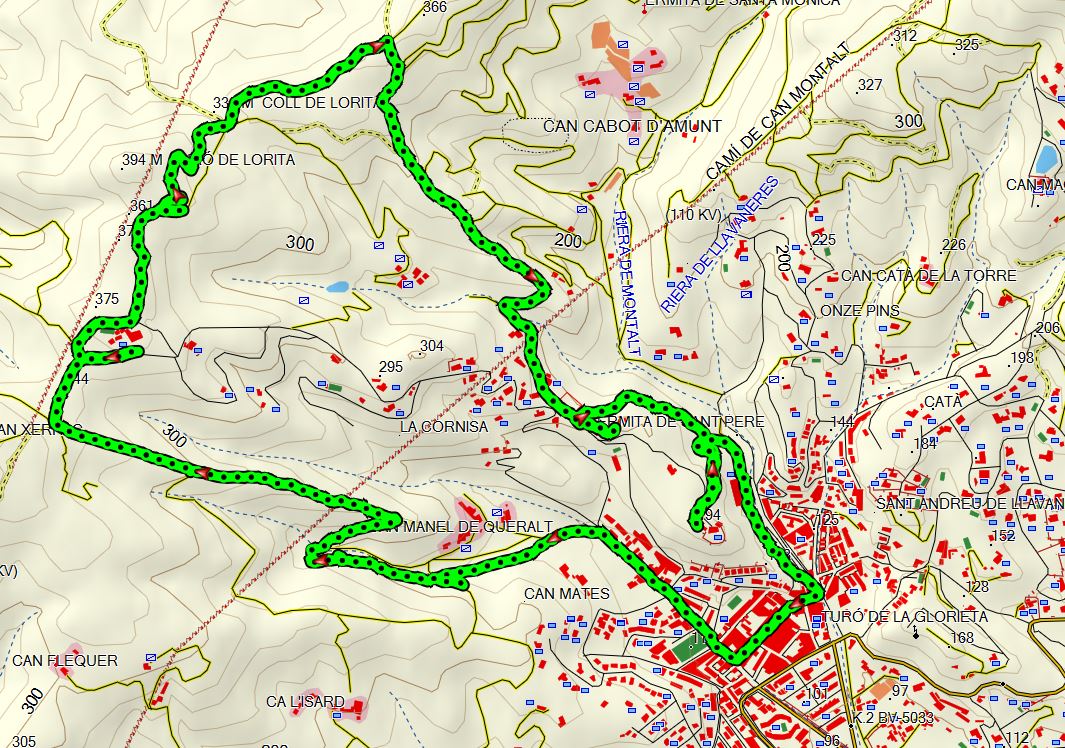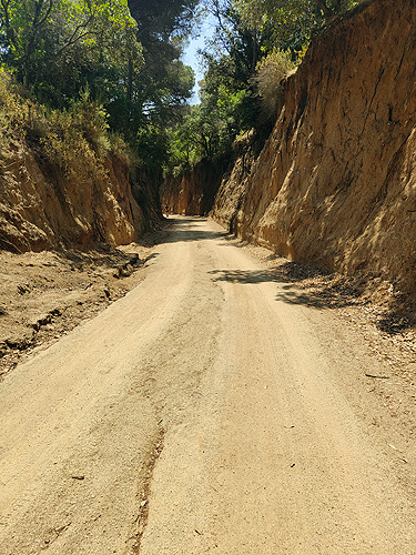 I seguiu amunt, amunt. Va virant cap a la dreta -en una cruïlla de senders amb una torre elèctrica al mig- fins arribar a una gran casa i a la carretera de la Cornisa -dreta- No l'heu d'agafar, sinó el camí que deixa la casa a la dreta. El camí -carrer Puigmal- està en molt mal estat fins a les portes d'entrada a la casa. Seguiu-lo i a la següent cruïlla, agafeu a l'esquerra, sense asfaltar.