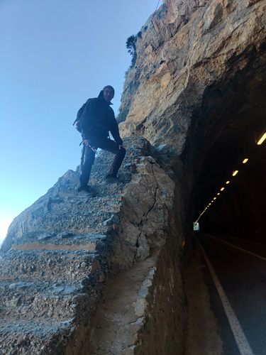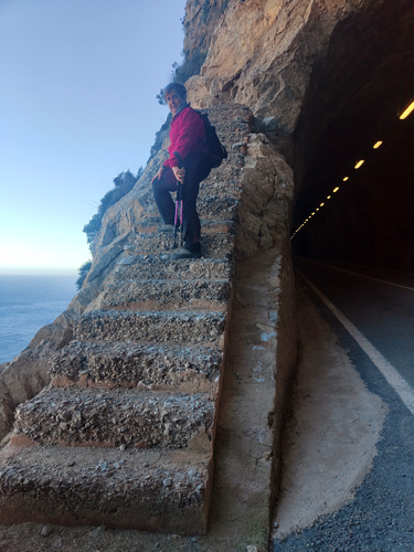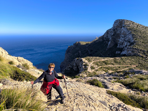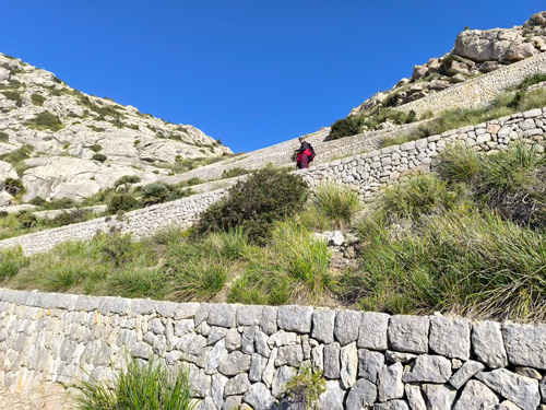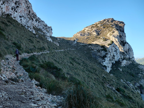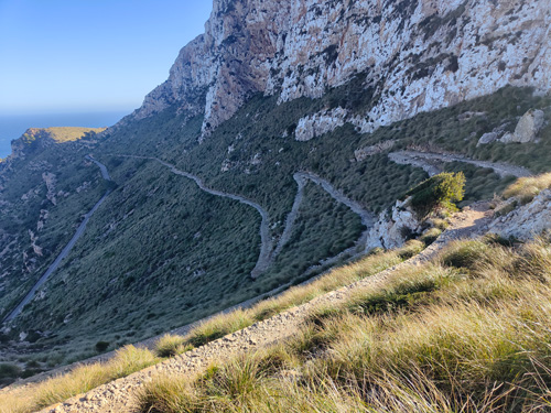 L'excursió que farem té un tram per carretera i túnel, el primer, i després s'enfila muntanya amunt per un traçat amb grans llaçades de quan no hi havia carretera. S'hi arriba a un coll i hi ha dues opcions. Pujar a El Fumat (seguint les fites) i baixar al següent coll, o baixar i pujar per més llaçades per arribar al mateix coll. Després, si o si, s'ha de baixar fins a la pista que ens porta a Cala Murta. És una part del Camí Vell de Cala Murta al Far de Formentor (17 kms) . Una altra opció és pujar per l'Escala de l'Amo, per sobre del túnel i anar directament al primer coll. Però són perilloses i més en dies de vent com el que teníem (ja veureu les fotos). Les fan fer per als treballadors de la carretera (anys 50 del segle XX) quan estaven fent el túnel per que no haguessin de fer una volta molt llarga per anar a l'altra boca. La tornada la fem per una pista quasi plana fins a on tenim el cotxe. Al mapa que està enllaçat a la fitxa tècnica es veu clarament les ziga-zagues que el camí vell del Far de Formentor, els trams que hem fet i els que no. Berta Solanas |