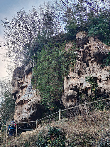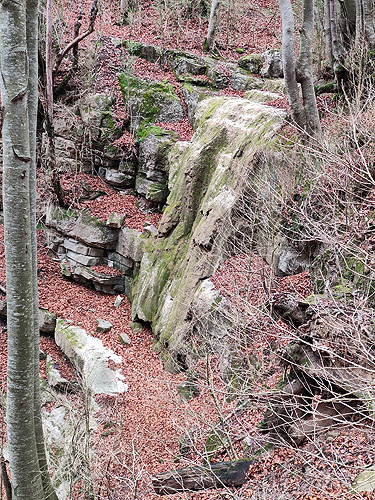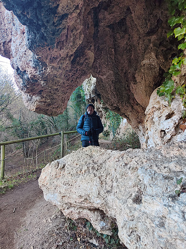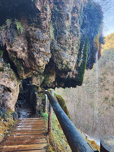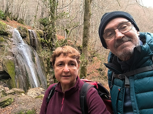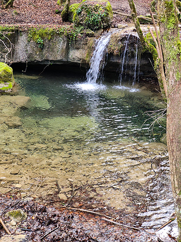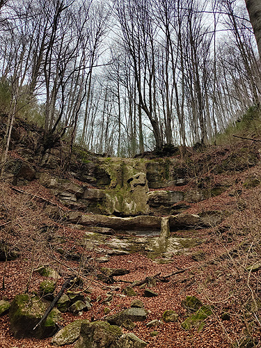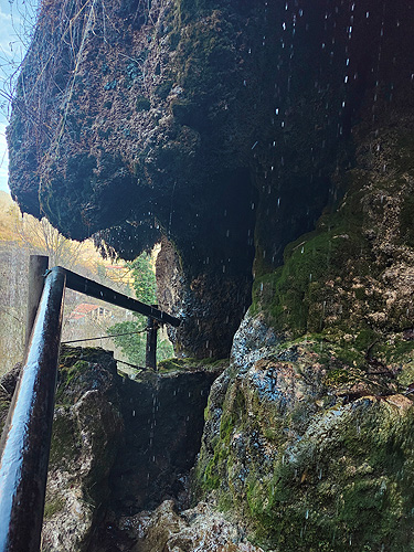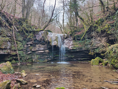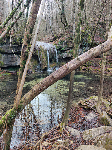 Passat el Saltant Costa de Llastanosa (el més gran del Torrent de la Masica), i un cop a sobre, tenim dues opcions. O seguir pel Torrent de la Masica o girar a l'esquerra per passar pel salt del Bisbe. Optem per la segona opció (més curta). La pujada és dreta i el camí éstà ple de fulles, és com si caminessis per la neu. La llàstima és que baixa poca aigua, massa poca. Arribem sobre la cascada i girem a l'esquerra per anar fins el Pou de Calç. Tornem al camí i comencem una travessia per un bonic bosc d'alzines i faigs. És fa una mica llarg fins que sortim a una pista, anem cap a la dreta i poc després a una carretera que ara l'agafem cap a l'esquerra. Veiem diverses indicacions amb llocs que no trobem ni tant sols el desviament (la Tosca queda uns metres avall o el jaciment de la Teuleria)