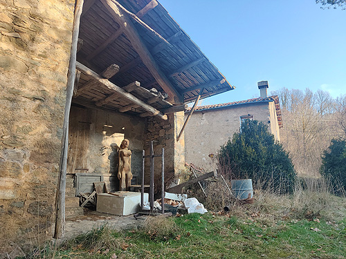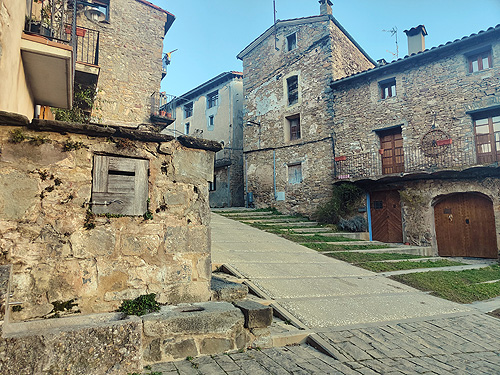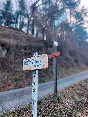 La seguim, passem per una casa en una curva pronunciada i seguim avall fins arribar al punt on s'acabava la carretera i començava la pista cap a la Font de la Tosca, per on hem anat al matí i tirem cap al poble. Agafem el desviament pel que hem sortit al matí a la pista i quan arribem a la casa de les escultures de fusta, NO girem a l'esquerra sinó que seguim cap a la riera de Vallfogona, la travessem per unes pedres i pugem amb força pendent, fins al poble sortint a la zona esportiva. Només cal tornar a on tingueu el cotxe o l'allotjament.